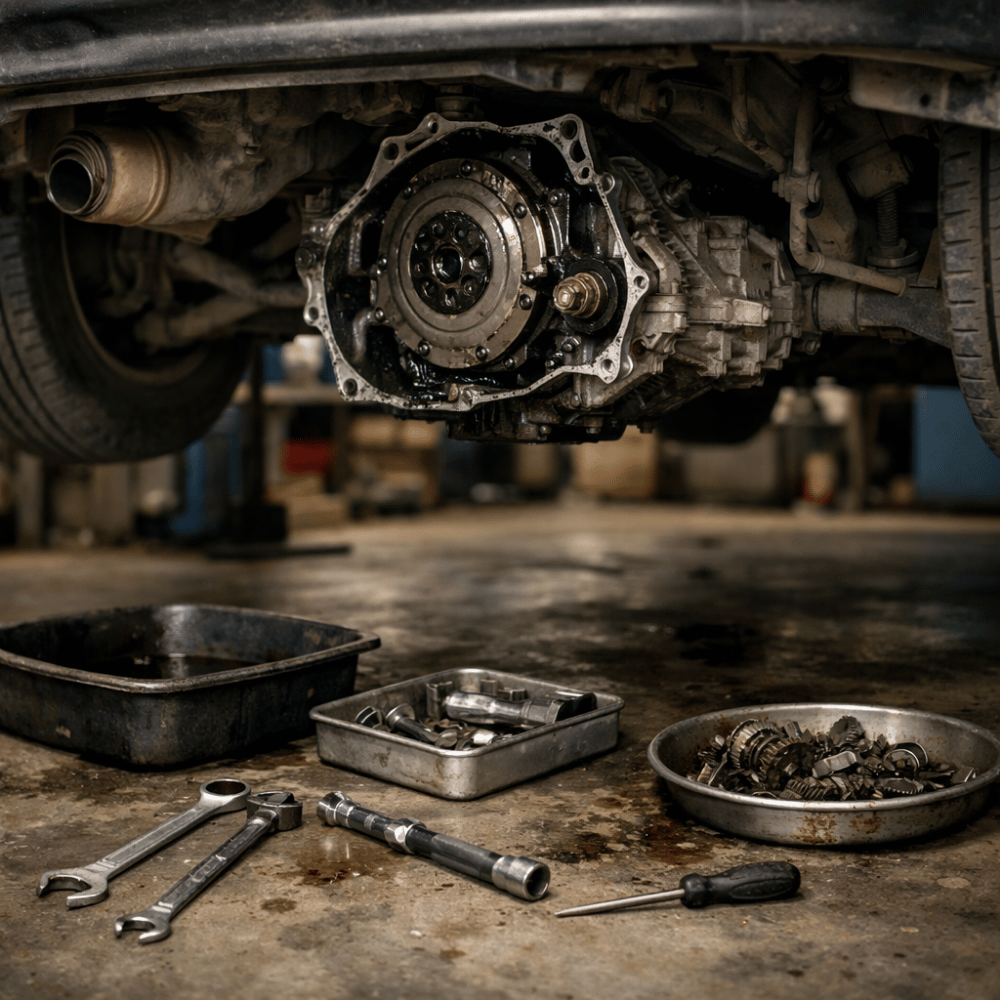 A RapidFix transmission service begins with a full OBD-II scan, transmission control module (TCM) fault code read, and a live-data road test to observe shift pressures, clutch engagement, and fluid temperature under load. From there we carry out the required work: fluid and filter flush to manufacturer volume and fill procedure, valve body clean or replacement, solenoid replacement, clutch pack or friction plate renewal, torque converter replacement, and full mechanical rebuild on high-mileage units. Clutch replacement on manual transmissions includes pressure plate, release bearing, pilot bearing, and flywheel resurface or replacement as a matched set.